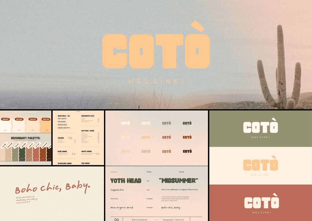 Yhtenäinen äänensävy, väripaletti, typografia ja visuaaliset linjat varmistavat, että Cotòn brändi pysyy vahvana ja tunnistettavana myös tulevaisuuden kasvaessa.