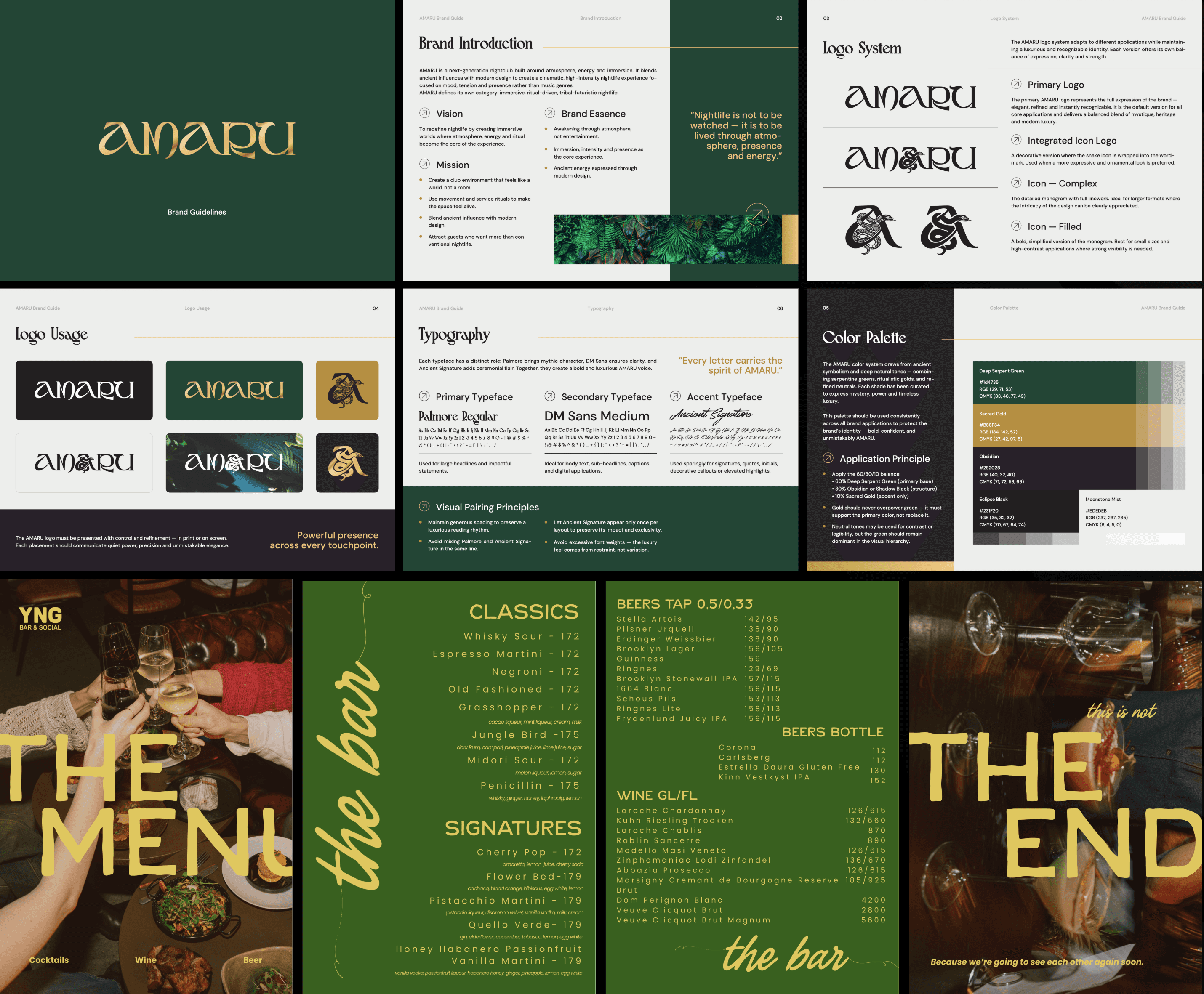 Sekä YNG Bar & Social että Amaru rakennettiin alusta loppuun. Tähän kuului nimeäminen, brändi-identiteetit, logot, visuaaliset järjestelmät, äänensävy ja molempien konseptien kokonaisvaltainen brändilinja.