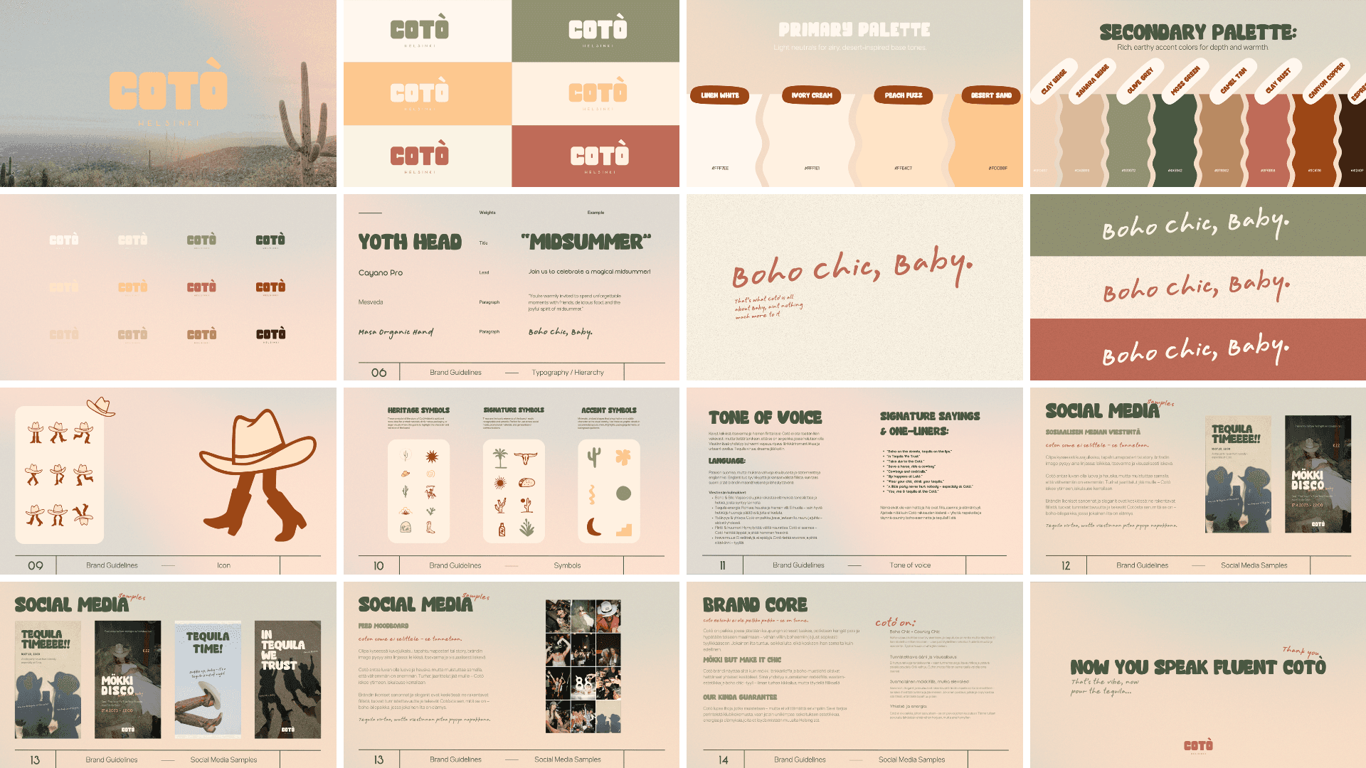 Yhtenäinen äänensävy, väripaletti, typografia ja visuaaliset linjat varmistavat, että Cotòn brändi pysyy vahvana ja tunnistettavana myös tulevaisuuden kasvaessa.